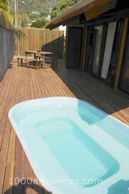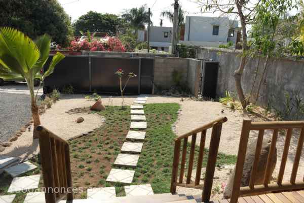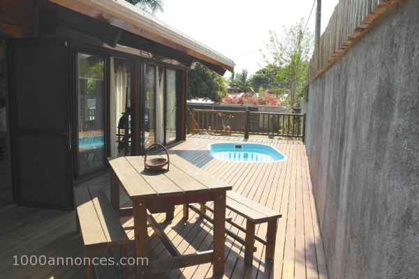 Ravissante villa en bois avec piscine et accès plage privé au calme, proche de toute commodités. Elle se compose : d’une immense terrasse, d’un espace séjour salle à manger avec cuisine américaine, 2 chambres en suite climatisées et une mezzanine. L’alarme, le jardinier ainsi que internet compris dans le loyer. La villa possède également un portail électrique, un générateur et une buanderie. Une visite s’impose !