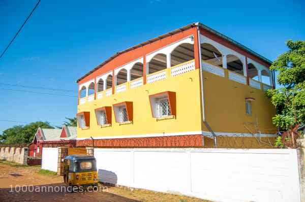 Situé à 10minutes du centre-ville Majunga Madagascar, une superbe villa de 450m2 battit sur deux étages sur un terrain de 500m2 et papier en règle (titré et borné). Clôturé, jardin avec gazon et parking pour deux voitures. Au réez de chaussez : deux grand magasins de 70m2 de chaque, débarras et salle d’eau. Au 1ere étage, tous carrelés composé de trois chambres à coucher avec trois salle d’eau de chaque, un grand salon, une salle à manger et une cuisine américaine. Et la deuxième étage : une grande terrasse de 150 m2 idéale pour une réception, fête en famille ou une réunion. A découvrir et visite avec le propriétaire.