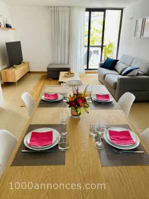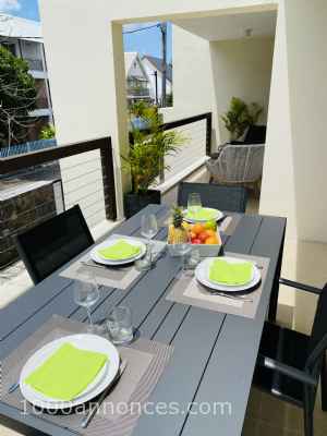 Appt neuf de 130m2: 2 chambres en-suite, un salon, salle à manger et cuisine ouverte tout équipée (four, micro onde, lave vaisselle, bouilloire, machine nespresso), 1 grande terrasse. Wifi, télé avec chaînes françaises, femme de ménage tous les jours inclus. A 5 min à pied de 2 plages : Mon Choisy et Trou aux biches. Piscine dans la résidence sécurisée. Arrêt de bus au pied de l'immeuble.